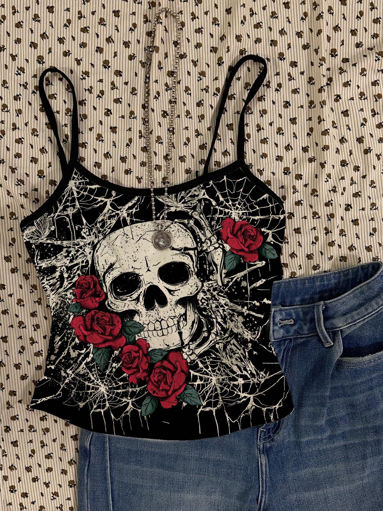 Show off bold Halloween style with our Rose Skull Print Sexy Black Camisole. This fitted, edgy summer top blends attitude and elegance — perfect for festivals, parties, or standout casual looks.